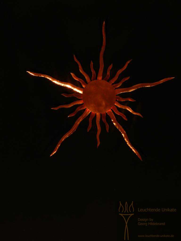 Die sonnenartige Gestaltung dieser Wandleuchte aus poliertem, teilweise brüniertem und lackiertem Kupfer ist ein besonderer Blickfang.